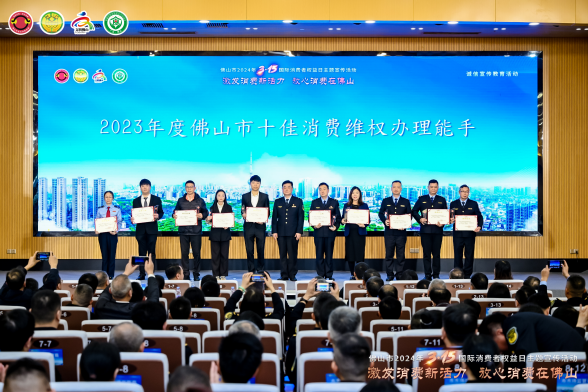 活動現(xiàn)場還為2023年度佛山市及市場監(jiān)管系統(tǒng)的十佳消費維權(quán)典型案例承辦單位、十佳消費維權(quán)辦理能手,“放心消費承諾”“線下無理由退貨承諾”單位,以及市級消費教育基地單位等授牌。