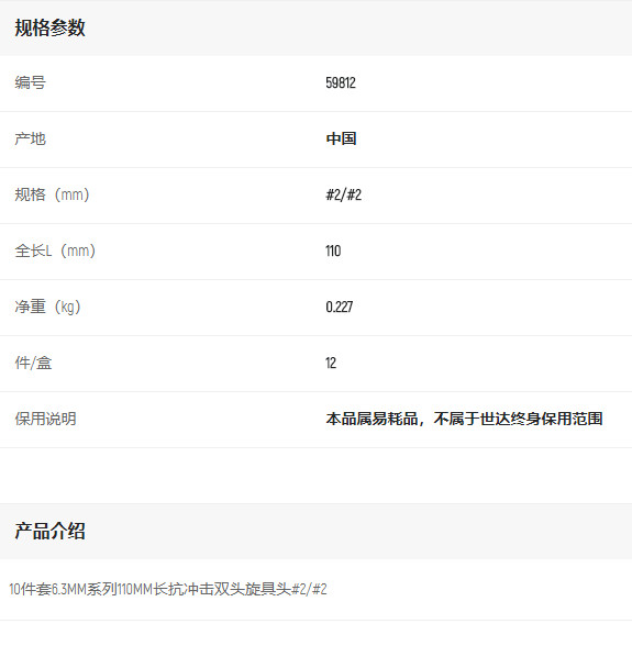 產(chǎn)品名字:世達(dá)10件套6.3MM系列110MM長抗沖擊雙頭旋具頭#2/#2