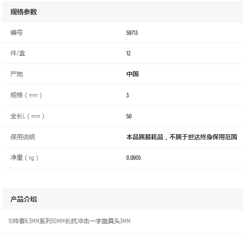 首頁>產品中心>螺絲批>旋具頭>世達10件套6.3MM系列50mm長一字旋具頭3MM
