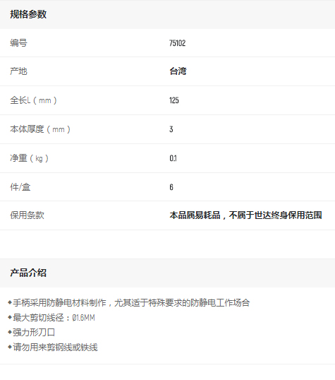 首頁>產(chǎn)品中心>電工電子工具>防靜電鉗子>世達(dá)防靜電手柄斜口鉗5寸